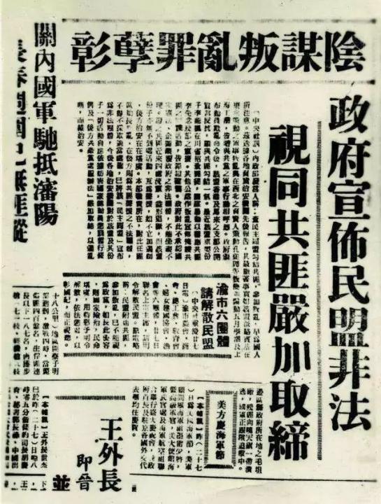 1947年10月27日,國民黨政府內(nèi)政部發(fā)言人指責民盟“勾結(jié)共匪,參加叛亂”,著令“嚴加取締,以遏亂蔭”,圖為當時報紙報道的消息