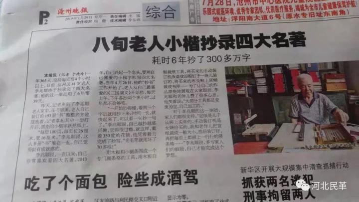 在習(xí)近平總書(shū)記中國(guó)夢(mèng)的感召下,2013年4月開(kāi)始,年逾八旬的滄州民革老黨員李兆順暗自擬定了用小楷抄寫(xiě)我國(guó)四大名著的夢(mèng)想計(jì)劃,經(jīng)過(guò)6年多筆耕不輟,2019年7月14日終于將總共330余萬(wàn)字的四大名著,抄寫(xiě)完畢。向中華人民共和國(guó)70華誕,獻(xiàn)上了一份大禮。
