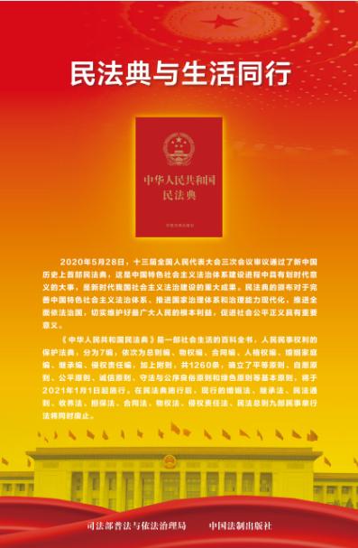 為深入貫徹落實(shí)習(xí)近平總書(shū)記關(guān)于廣泛開(kāi)展民法典普法工作的重要指示,司法部普法與依法治理局會(huì)同中國(guó)法制出版社編輯了《民法典與生活同行》系列掛圖(一套9張),在智慧普法平臺(tái)(中國(guó)普法網(wǎng))發(fā)布,供各地各部門(mén)免費(fèi)下載使用。