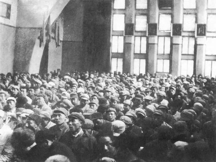 1945年4月至6月,黨的七大在延安楊家?guī)X中央大禮堂召開。主席臺上方的橫幅“在毛澤東的旗幟下勝利前進(jìn)”,同會場后面的題詞“同心同德”,烘托出會議的主題。黨的七大使全黨在馬克思列寧主義、毛澤東思想的基礎(chǔ)上達(dá)到空前的團(tuán)結(jié)。圖為七大會場(資料圖片)。
