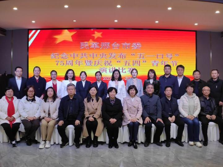 4月22日,民革邢臺市委會舉辦紀念中共中央發(fā)布“五一口號”75周年暨慶祝“五四”青年節(jié)演講比賽,邢臺市人大常委會副主任、民革邢臺市委主委楊瑞碩,副主委霍麗霞、呂永樂、劉聚良、胡立杰出席活動并擔任評委。13位民革黨員參賽,40余名黨員觀看。
