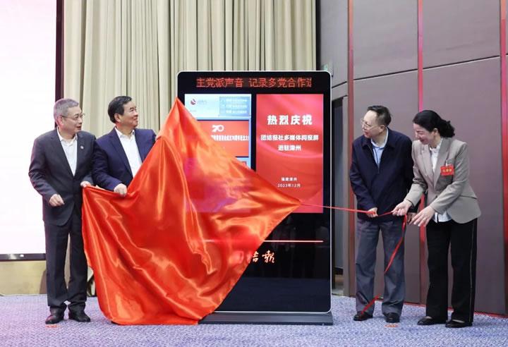 何報(bào)翔(左二)、高飛(右二)、夏先鵬(左一)、吳衛(wèi)紅(右一)為團(tuán)結(jié)報(bào)社多媒體閱報(bào)屏進(jìn)駐漳州揭幕